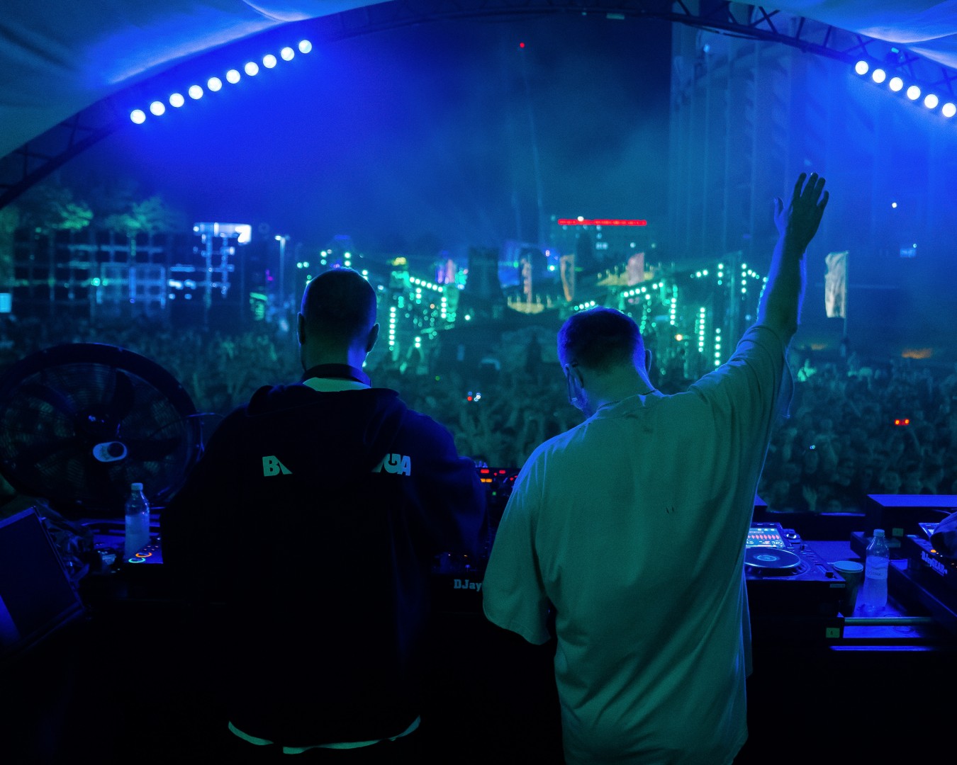 Ukrainian deejays and producers Artur & Batish, better known by their artist name ARTBAT, perform on stage on the last day of the SAGA Festival in Bucharest, Romania on June 5, 2022.