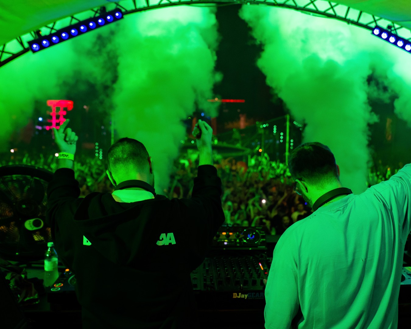 Ukrainian deejays and producers Artur & Batish, better known by their artist name ARTBAT, perform on stage on the last day of the SAGA Festival in Bucharest, Romania on June 5, 2022.