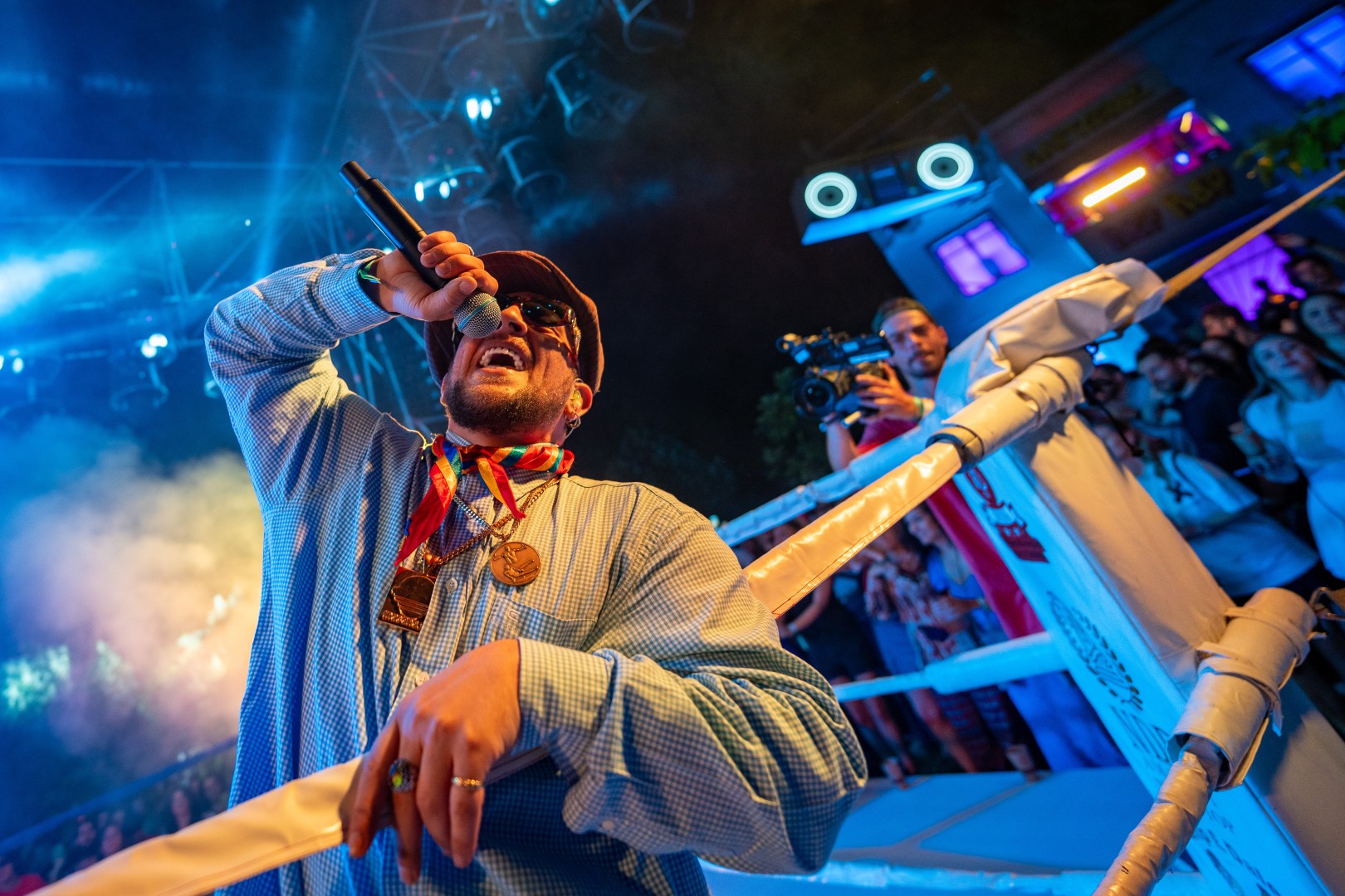 Romanian rapper Constantin-Bogdan Dinescu, better known by his artist name Macanache, performs at the Nostalgia Festival in Izvor Park in Bucharest, Romania on June 24, 2022.