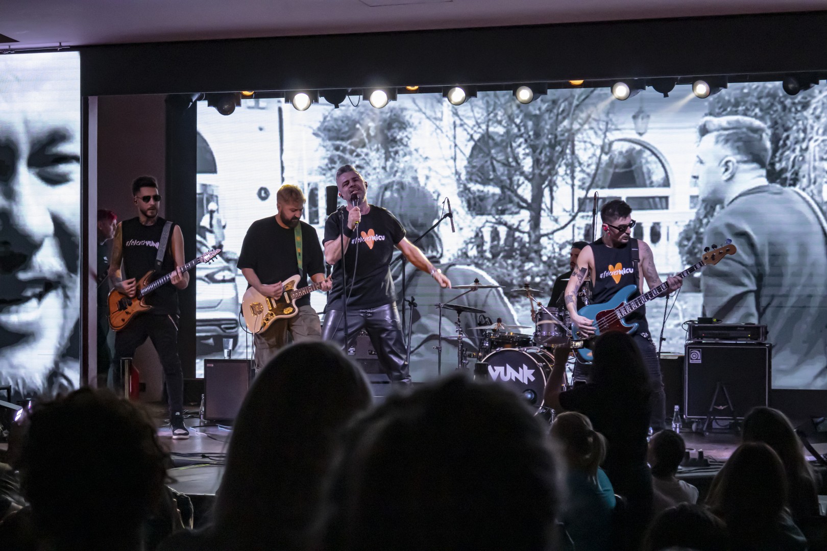 Romanian pop-rock band VUNK performs with romanian musician Gabi Maga during the concert "Se aude până la tine?" in memory of drummer Nicu Sârghea at Hard Rock Cafe in Bucharest, Romania on March 6, 2025.